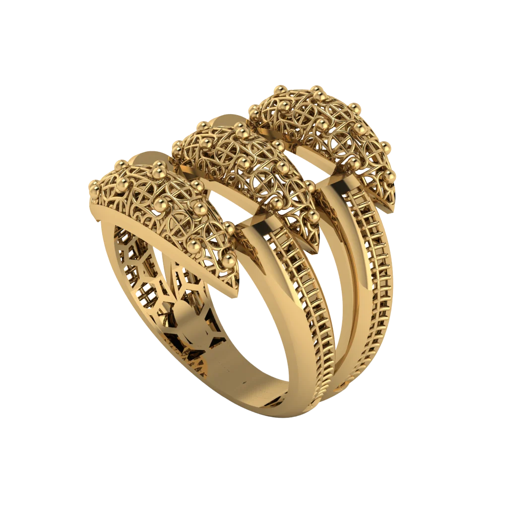 Сложное многослойное переплетение с ажурными лентами и несколькими участками паве: верхняя часть напоминает кружевной веер, а полированное золото подчёркивает рельеф и объём композиции.
