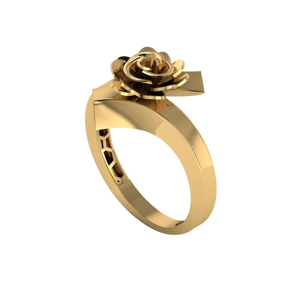 Кольцо с миниатюрной розой на вершине: цветок выполнен объёмно и читается как главный акцент, а гладкая шинка и полировка золота сохраняют чистый, романтичный характер украшения.