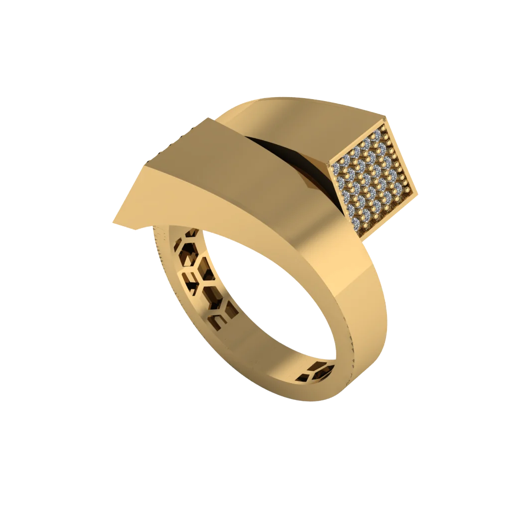 Архитектурное кольцо с крупным изгибом и квадратной площадкой паве на торце: широкие плоскости дают яркие отражения, а камни добавляют точечный блеск в строгой геометрии.