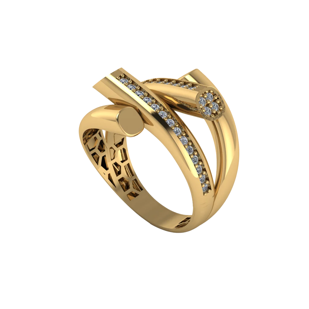 Динамичная модель с раздвоенной шинкой и диагональными линиями: по одной ленте идёт дорожка мелких камней, а на другом крае виден одиночный акцент, подчёркивающий игру света в золоте.