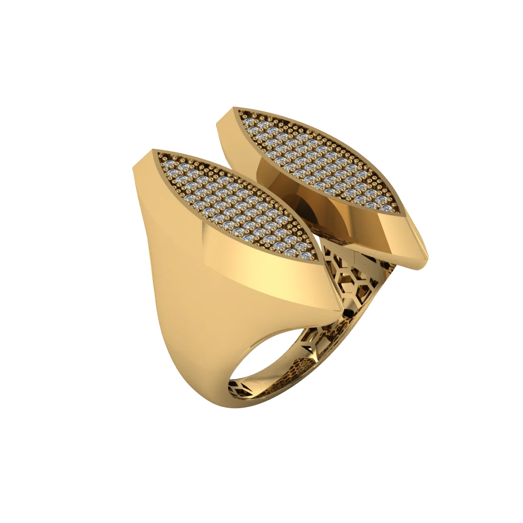 Кольцо с перекрещивающимися лентами, где внутренняя дуга усыпана мелкими камнями: переплетение создаёт динамику, а сочетание паве и полировки делает дизайн выразительным и объёмным.
