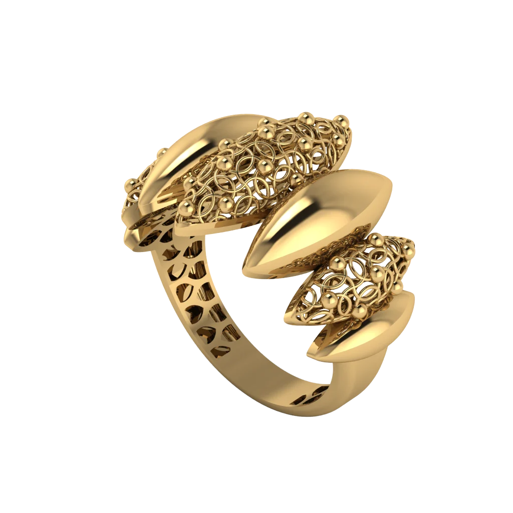 Фактурное кольцо с двумя спиральными завитками, заполненными паве: один элемент крупнее и богаче по рельефу, второй поддерживает баланс, а полированное золото усиливает эффект кружевного сияния.