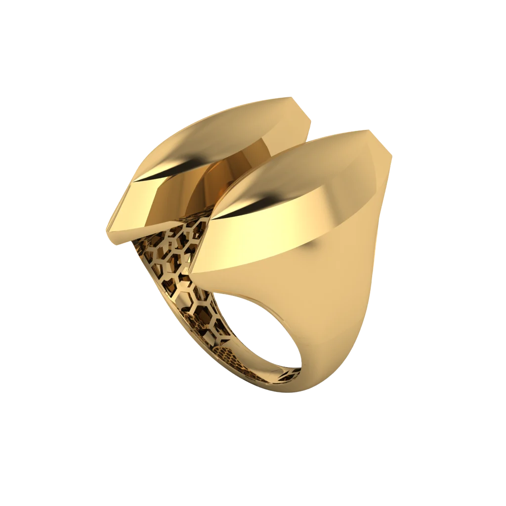 Лаконичный дизайн с высокой гладкой площадкой без вставок: верх напоминает щит, а внутренняя часть украшена ажурным рисунком, поэтому при повороте кольцо красиво играет отражениями полированного металла.