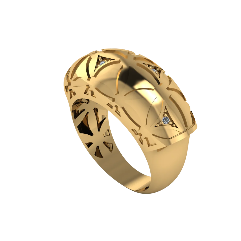 Кольцо-ободок с плотной резьбой и повторяющимися символами: крупные ажурные отверстия по бокам создают лёгкость, а гладкие грани поддерживают строгий, собранный характер полированного металла.