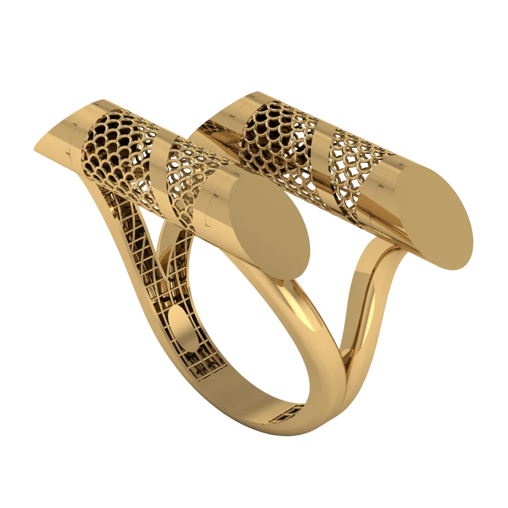 Двойная шинка с ажурной фактурой переходит в высокий перекрёст двух гладких площадок: круглые торцы смотрятся как аккуратные акценты, а зеркальная полировка подчёркивает чистую геометрию металла.