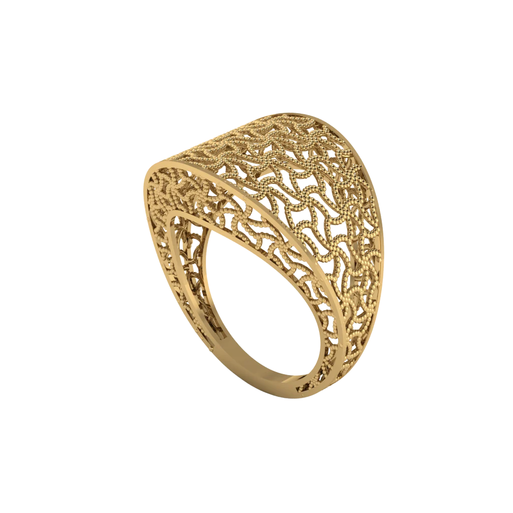 Печатка с округлой верхней площадкой и плотной резьбой: рисунок напоминает мелкую сетку, форма плавно сходит к шине, а объёмное золото выглядит особенно выразительно за счёт перфорации по бокам.