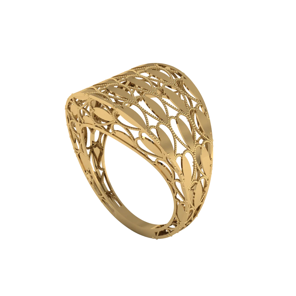 Широкая ажурная шина с рисунком из дуг и ромбов: верх формирует мягкий купол, сетка просматривается насквозь, а золото по кромкам отполировано до зеркального сияния.