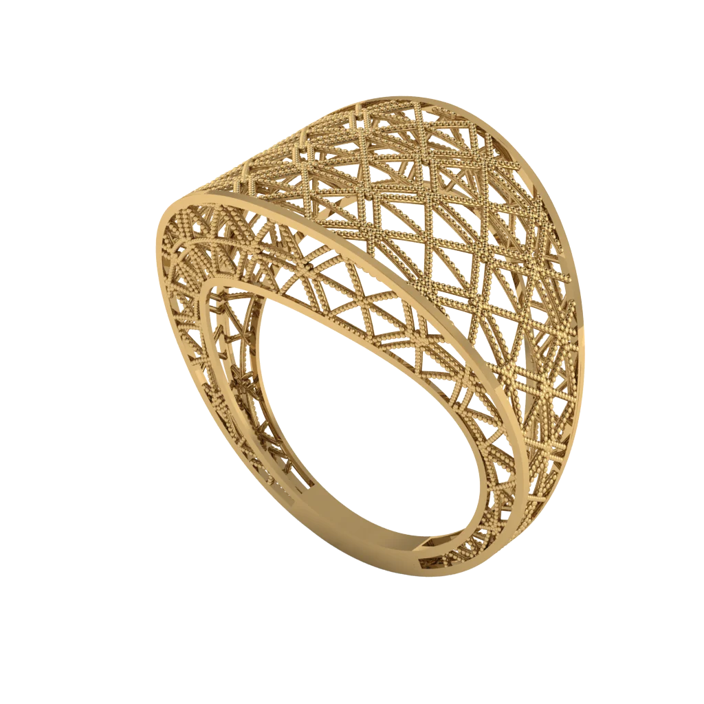 Кольцо с широким ажурным куполом и диагональными линиями плетения: крупные прорези создают глубину, а ровные гладкие края добавляют строгий контраст к кружевной фактуре верхней части.
