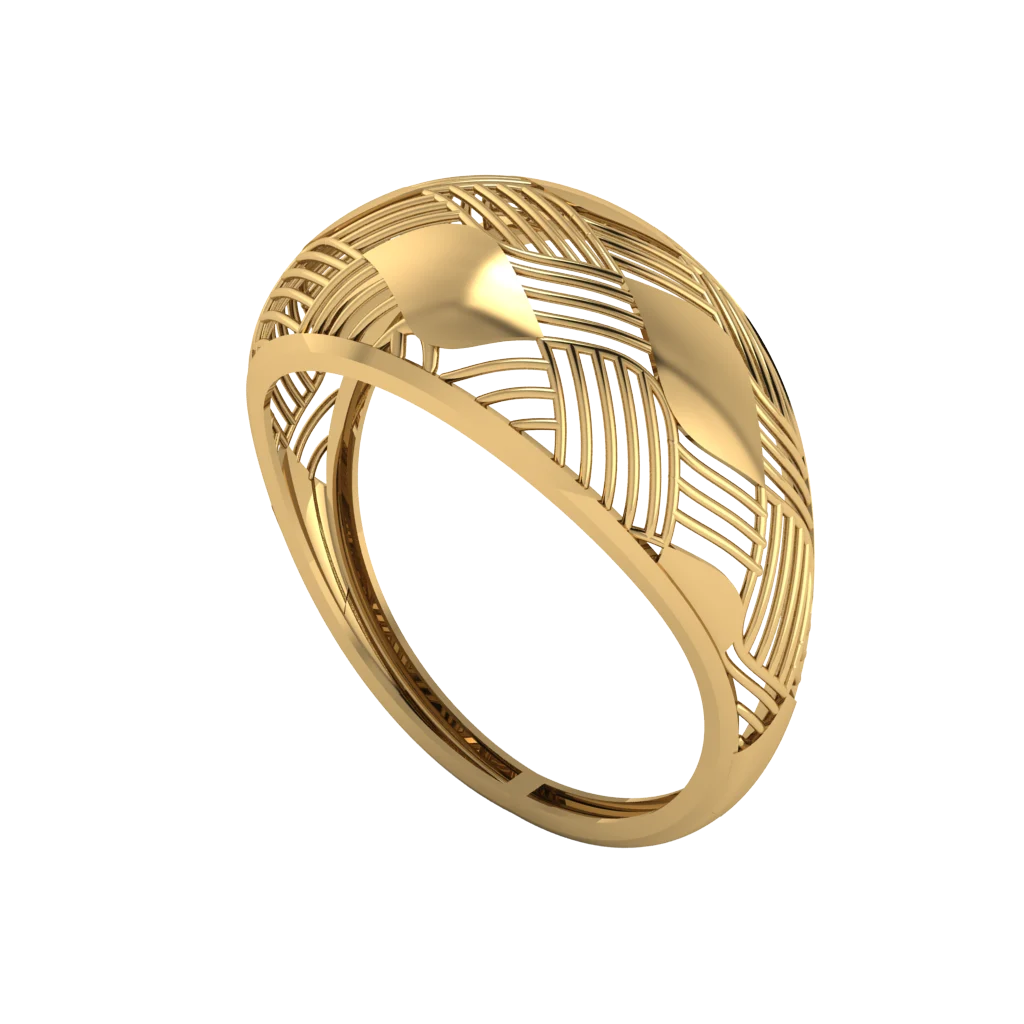 Кольцо-ободок с параллельными диагональными вырезами и гладкими ребрами: рисунок напоминает струны, внутри видны окна ажура, поэтому массивный силуэт выглядит легче и очень современно.