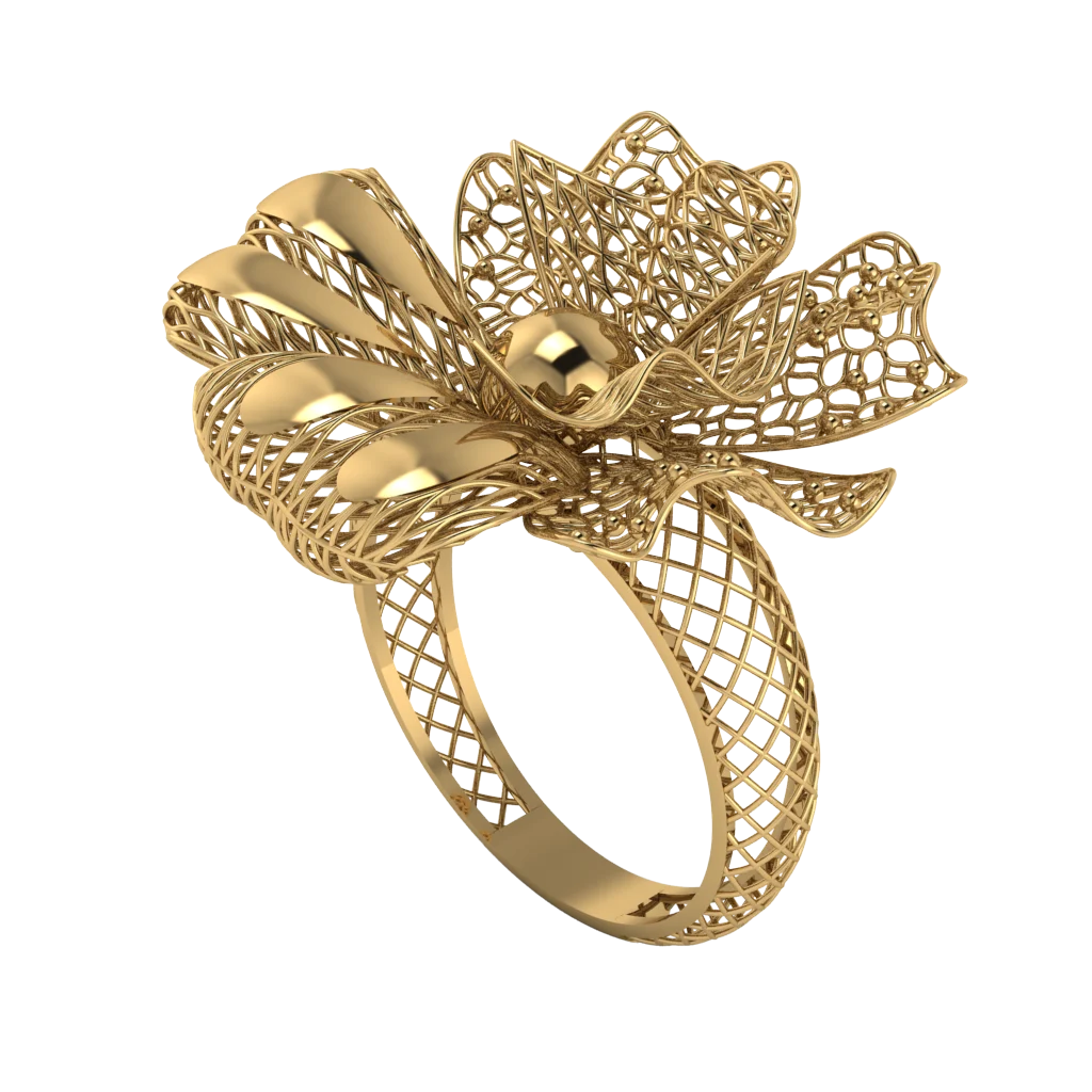 Крупное кольцо с пышным цветком и выразительной ажурной сердцевиной. Восточный характер дизайна хорошо раскрывается в золоте и смотрится очень нарядно.
