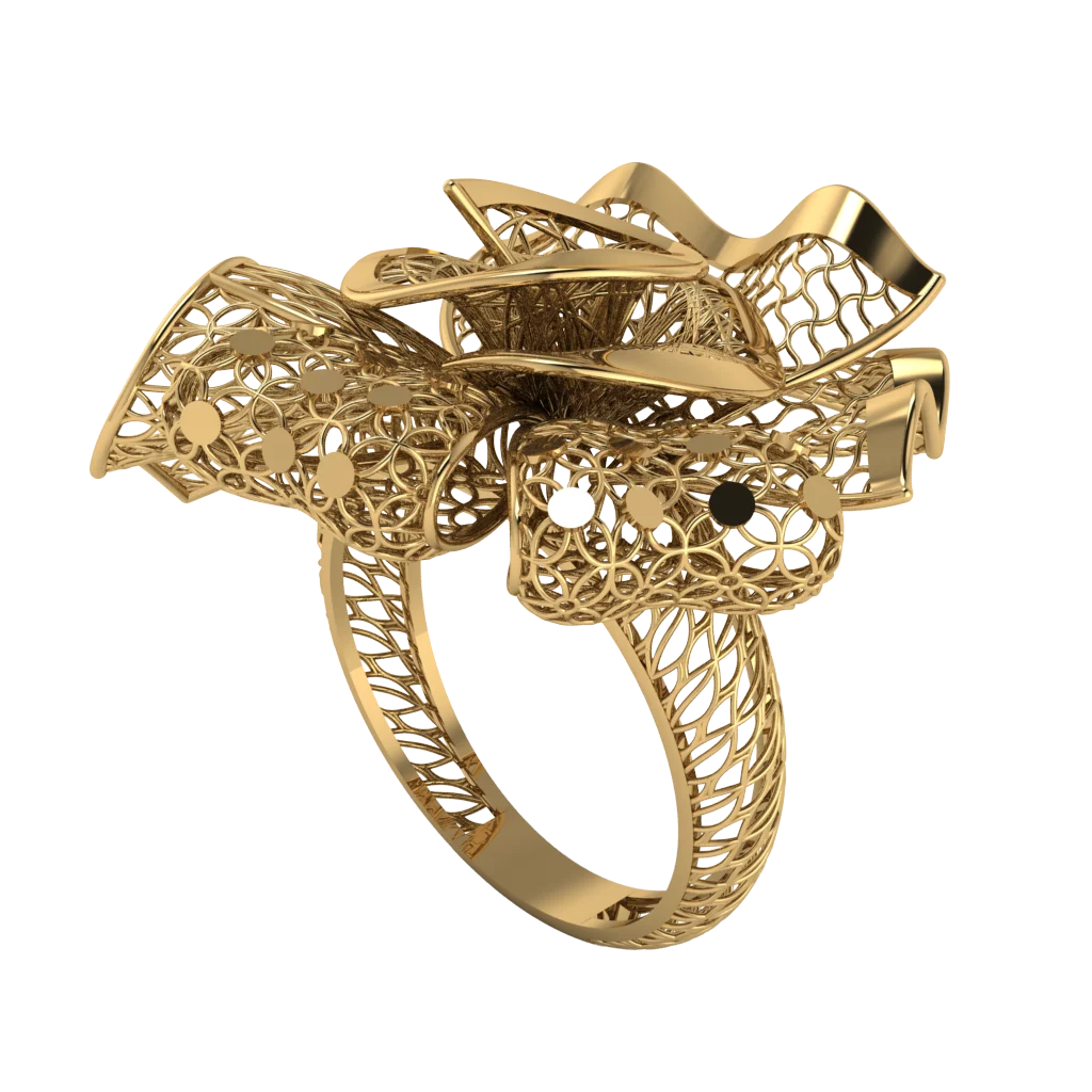 Кольцо с фантазийным цветком, где лепестки собраны в многослойную геометрию с ажуром. Золотая основа делает композицию более тёплой и выразительной.