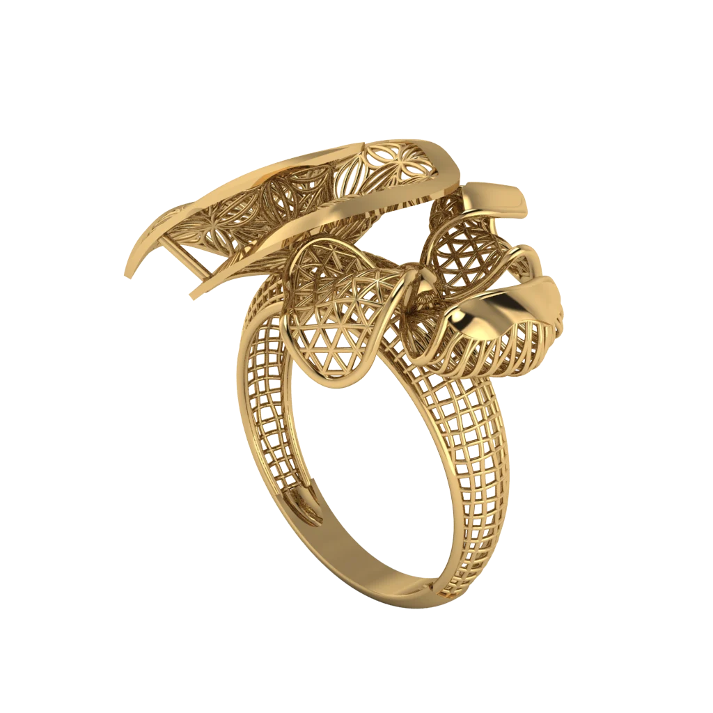 Фантазийная модель с цветочным мотивом и удлинёнными лепестками, направленными в стороны. Тёплое золото подчёркивает пластичность формы и ажурный рисунок.