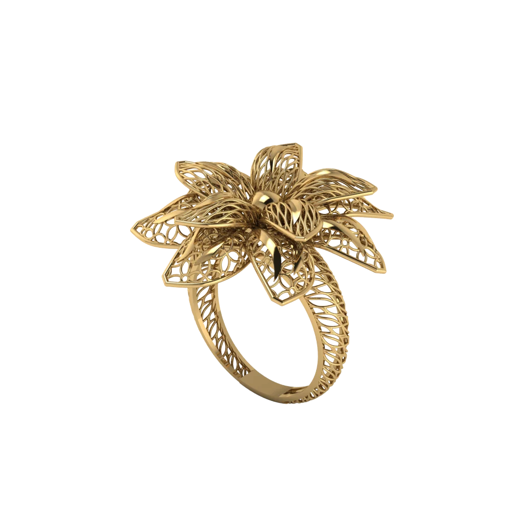 Нарядная модель с крупной цветочной розеткой из тонких ажурных лепестков. Золото подчёркивает богатый рисунок и придаёт украшению праздничную выразительность.