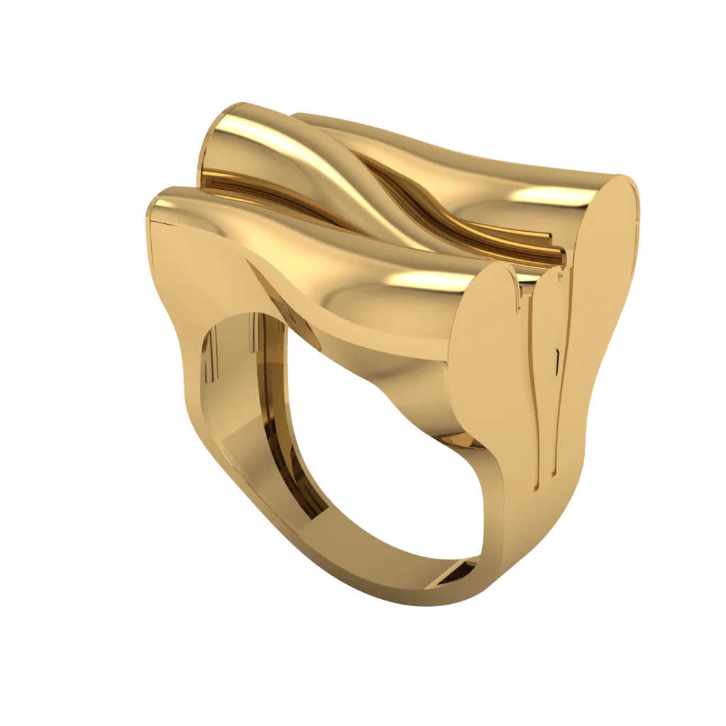 Широкое кольцо с волнистым верхом и сложными изгибами, словно драпировка. Скульптурная форма, глянец и выразительный объем. Подходит как подарок и для себя.