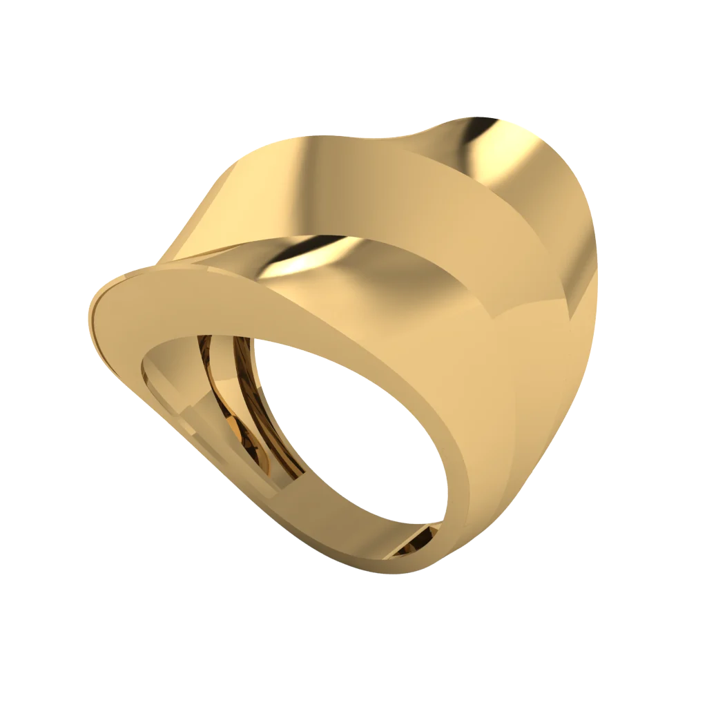 Кольцо с широким щитом и диагональным разрезом, верх напоминает складку. Строгий характер, полировка и современная геометрия. Отличный выбор для стильного гардероба.