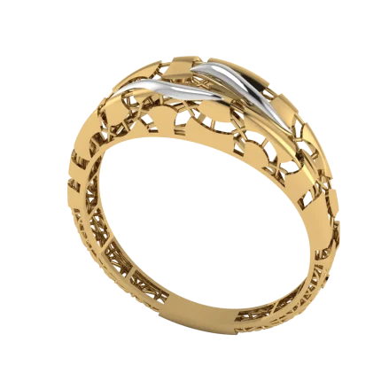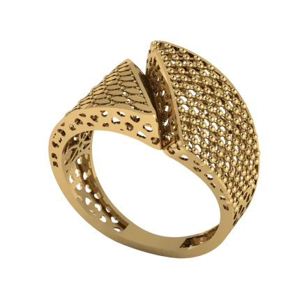 Верх собран из нескольких волнообразных лент с тонкой фактурой, образуя динамичный ритм; тёплое золото подчёркивает переливы, а гладкие кромки создают чистый контур и блики на изгибах.