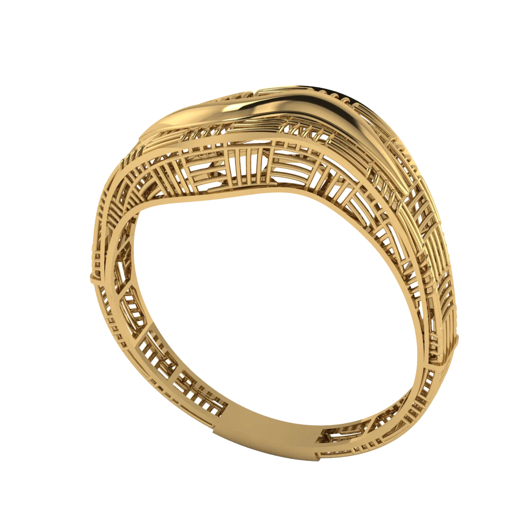 Переплетение лент с плотной фактурой образует объёмный верх и мягкий узел у вершины; тёплое золото подчёркивает скульптурность, а полировка на гладких зонах даёт чистые зеркальные блики.