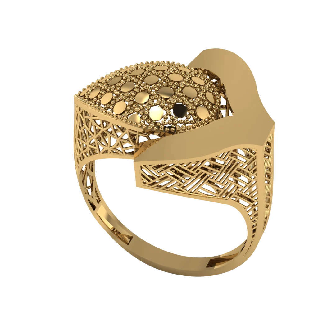 Кружевной верх с мелкой сеткой и мягким волнистым краем напоминает листовую панель; тёплое золото подчёркивает рельеф, а полировка на гладких кромках создаёт чистые зеркальные отражения.