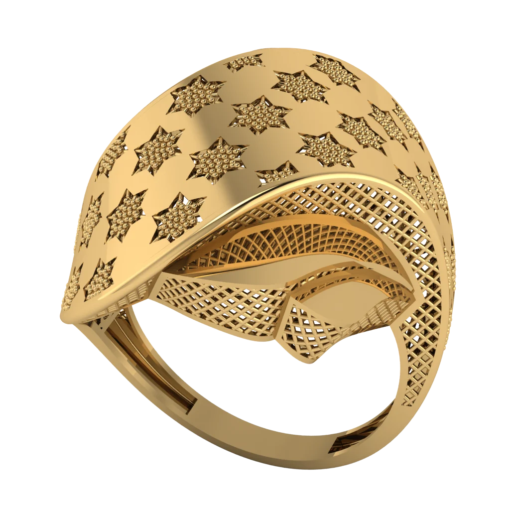 Широкая шинка с крупным листовым мотивом и матово‑фактурным рисунком выглядит выразительно; в тёплом золоте полировка по кромкам подчёркивает контур, а рельеф даёт глубину и игру света.