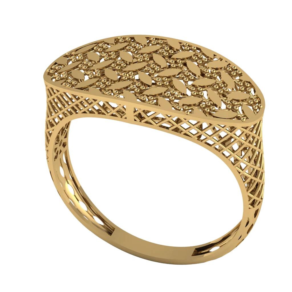 Кружевная площадка с мелкими отверстиями и изогнутым краем создаёт лёгкий щиток без камней; тёплое золото подчёркивает глубину ажура, а гладкие кромки дают чистые зеркальные отражения.
