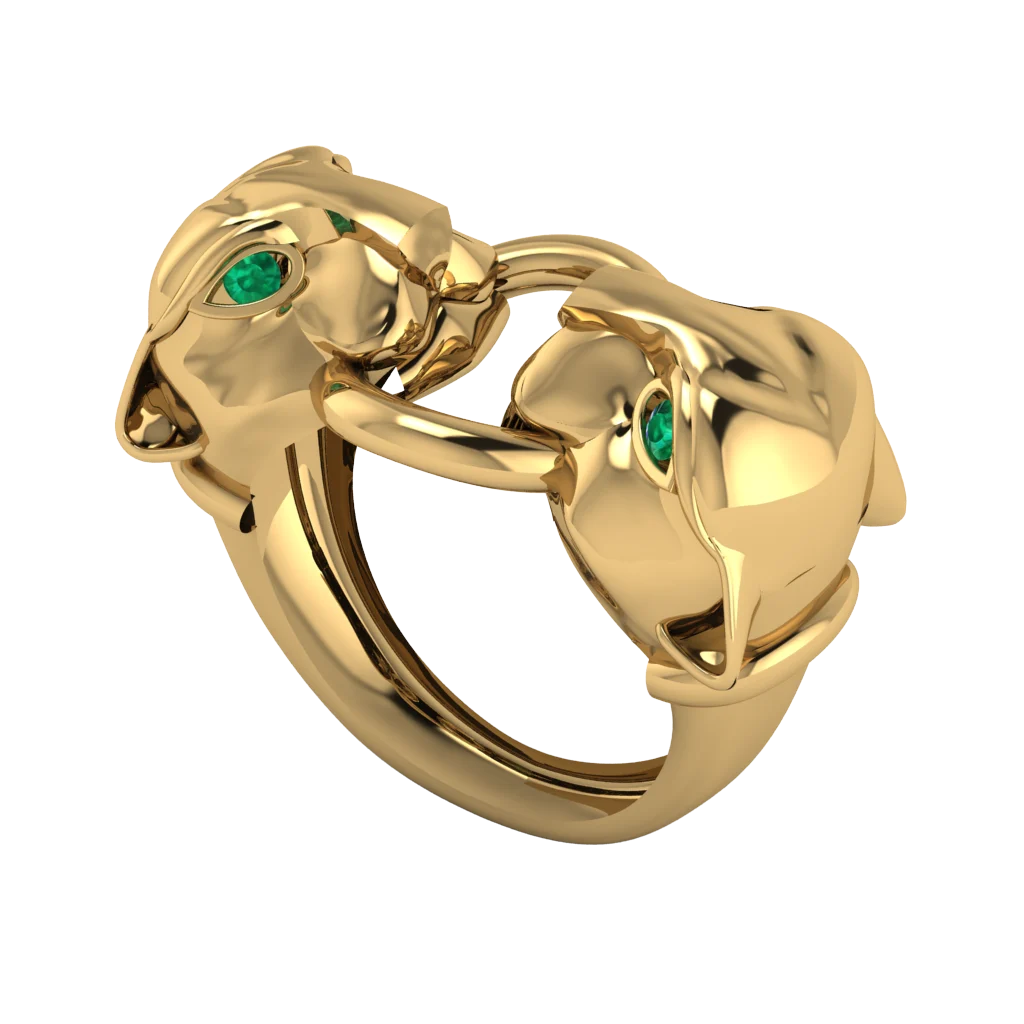 Кольцо с головой пантеры и зелёными глазами выглядит смело и хищно. Гладкое золото усиливает пластику формы, а двойная шинка добавляет украшению характер.