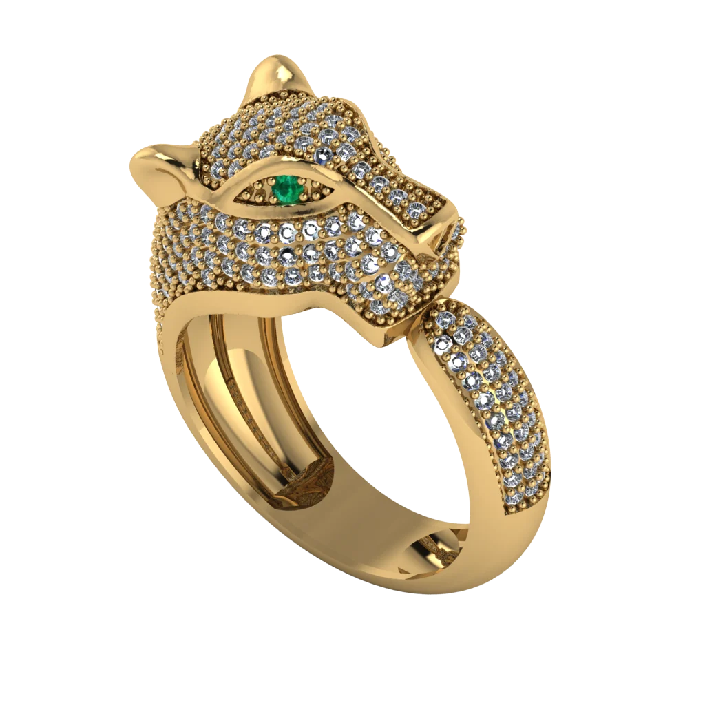 Элегантное кольцо с головой пантеры, зелёными глазами и плавной дорожкой светлых камней подходит для яркого образа. Золото добавляет модели мягкий, тёплый блеск.