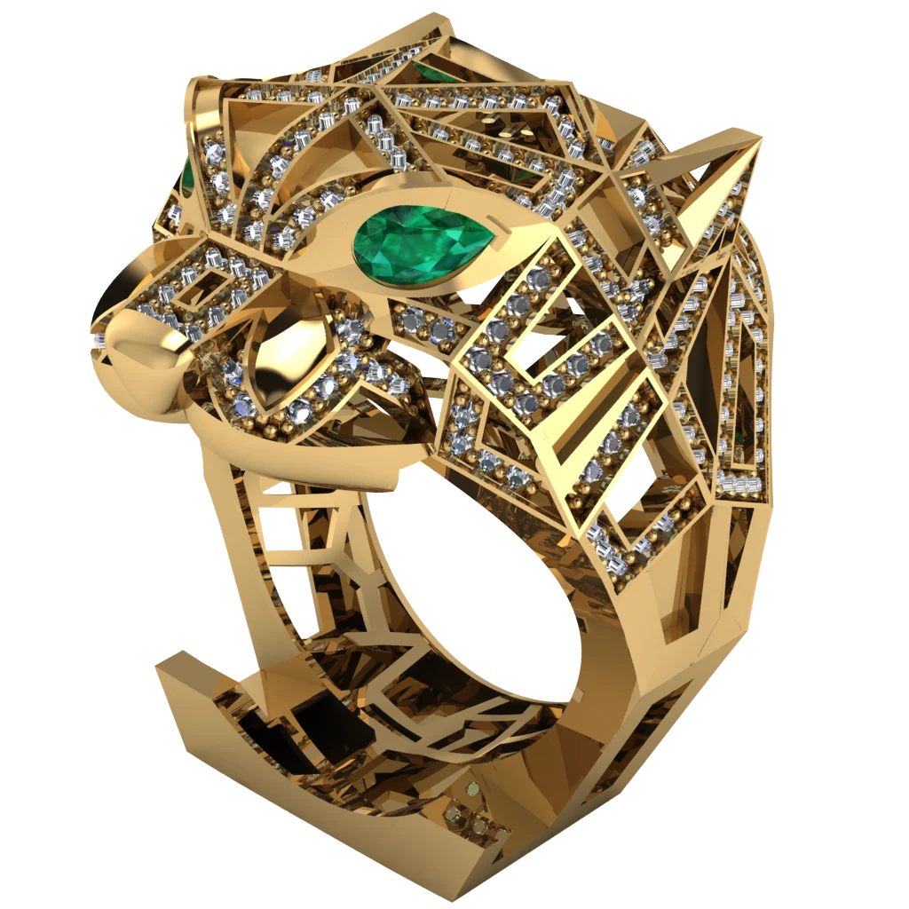 Архитектурное кольцо с мордой зверя, зелёным камнем и сложным ажурным корпусом выглядит как акцентное украшение. Золото подчёркивает необычную графику формы.
