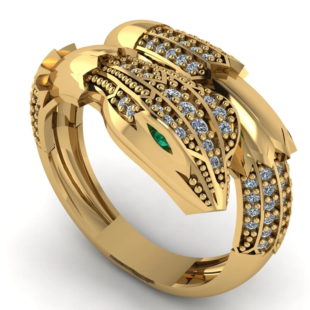 Широкое кольцо с плавными дугами, зелёным камнем и дорожками светлых вставок напоминает крылья или хищный силуэт. Золото подчёркивает рельеф и мягкий блеск.