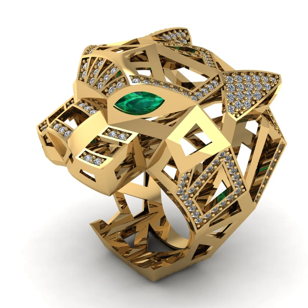 Ажурная печатка в виде головы хищника с зелёным камнем в центре и россыпью светлых вставок создаёт смелый образ. Золото усиливает эффект сложной формы.
