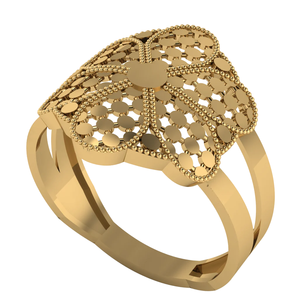 Ажурный верх с плотной перфорацией и мягкой волной напоминает кружевной купол: отверстия создают лёгкость, шина гладкая, а золото подчёркивает аккуратный контур и глубину узора.