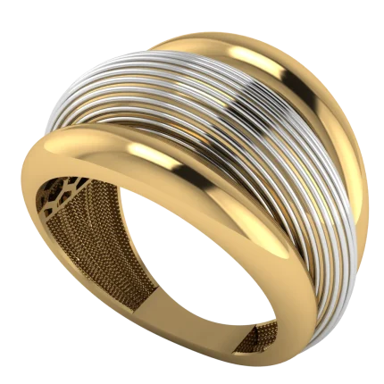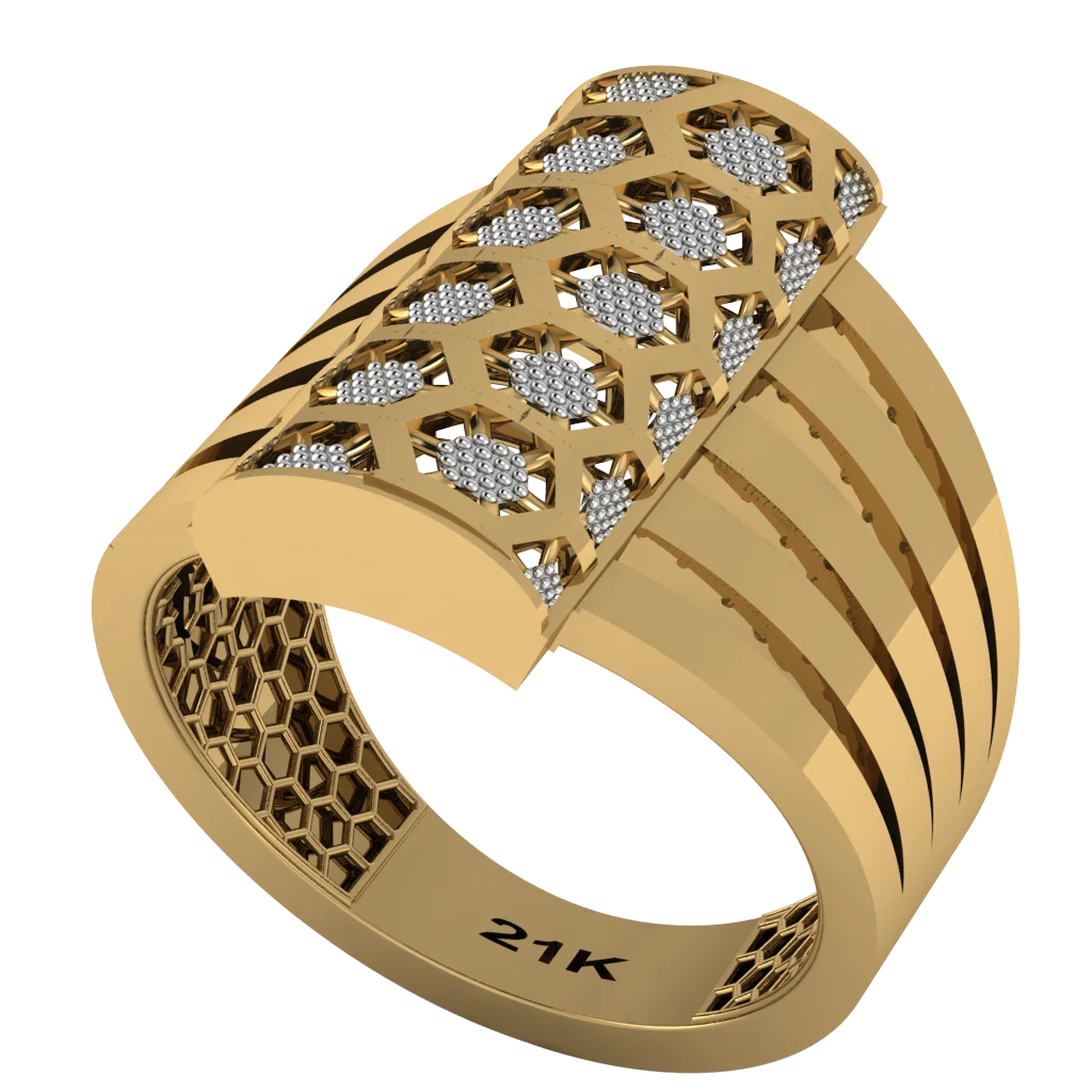 Кольцо с высоким щитом и ажурными треугольниками, корпус с плавными полосами — выразительная геометрия и эффектный силуэт на руке. Комфортно сидит и красиво ловит свет.