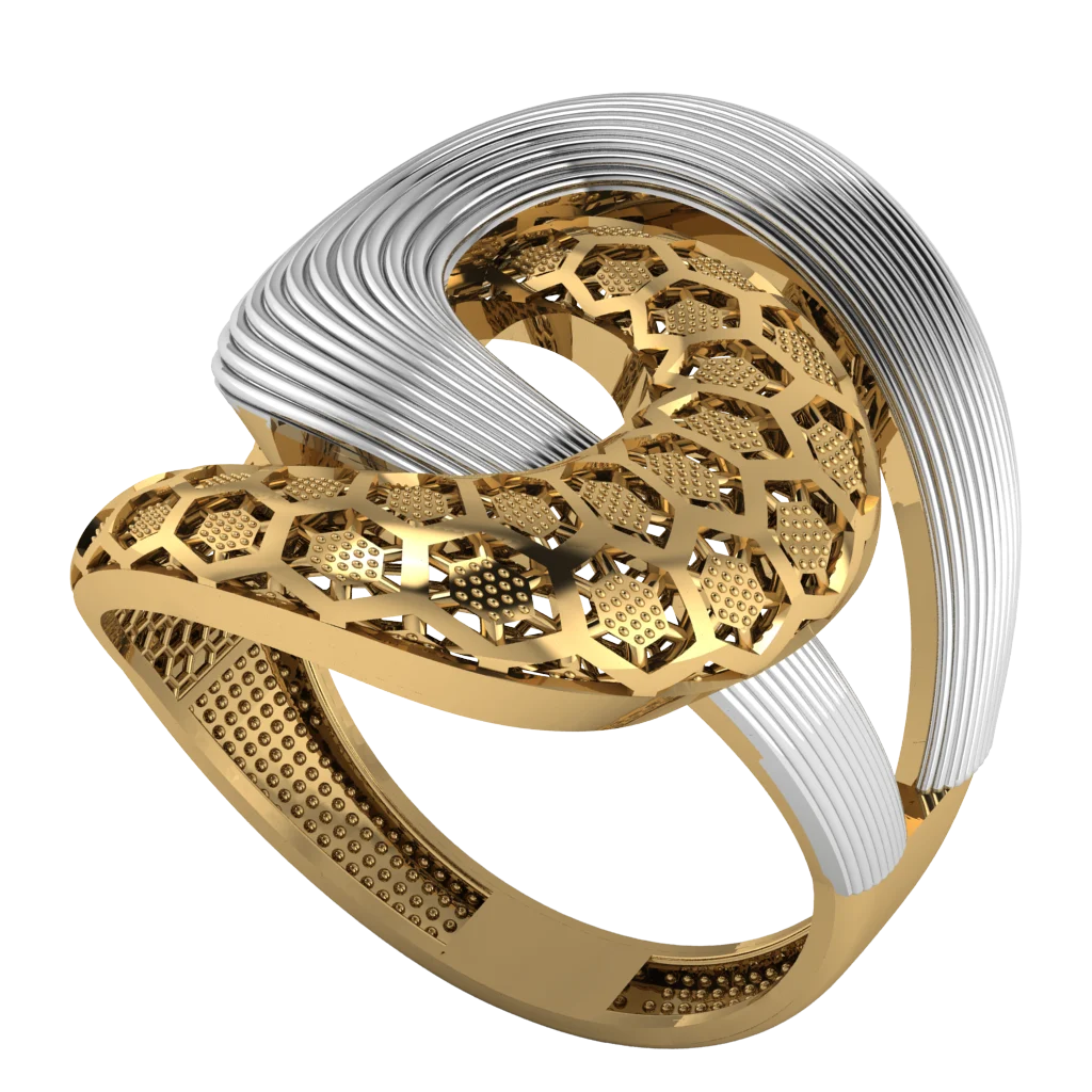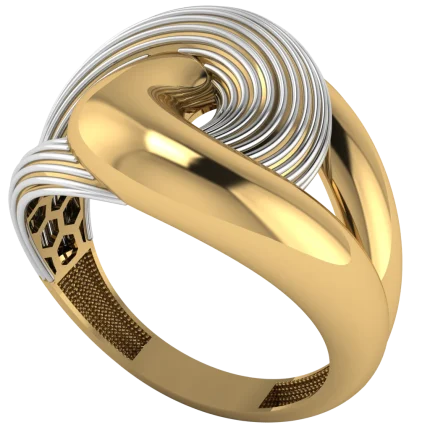 Двухцветное кольцо с волной из светлых нитей и ажурным сердцем внутри — романтичный мотив, золото и современная пластика линий. Отличный выбор для современной коллекции.