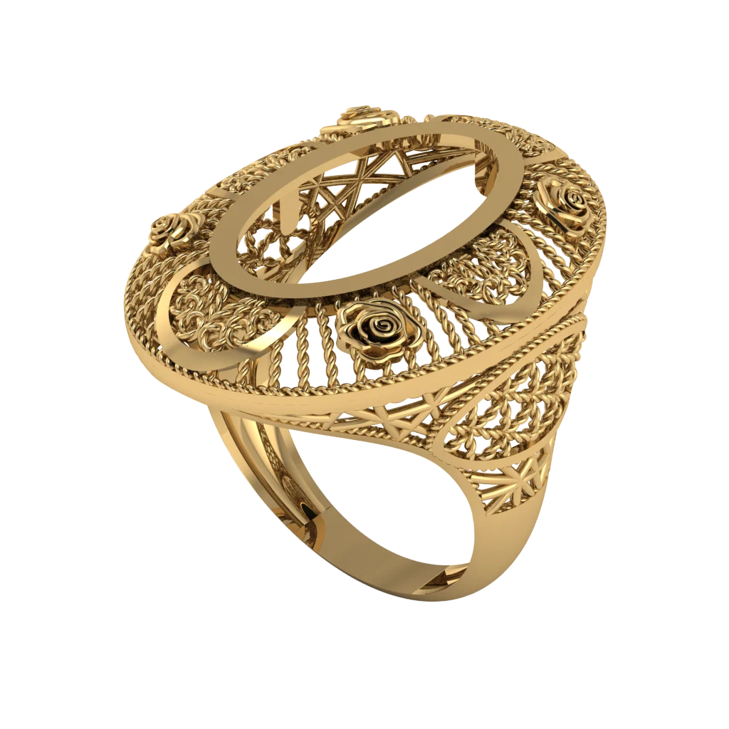 Изящная модель с овальным верхом, открытыми вертикальными линиями и тонкой декоративной рамкой. В золоте кольцо смотрится легко и очень женственно.