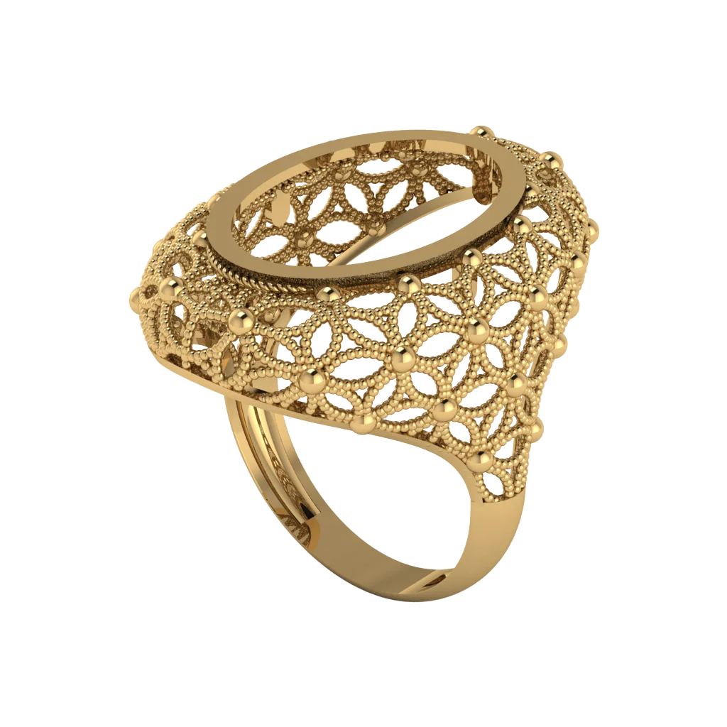 Женская модель с овальной площадкой и кружевным арабским узором по всему корпусу. В золоте кольцо выглядит тонким, объёмным и очень праздничным.