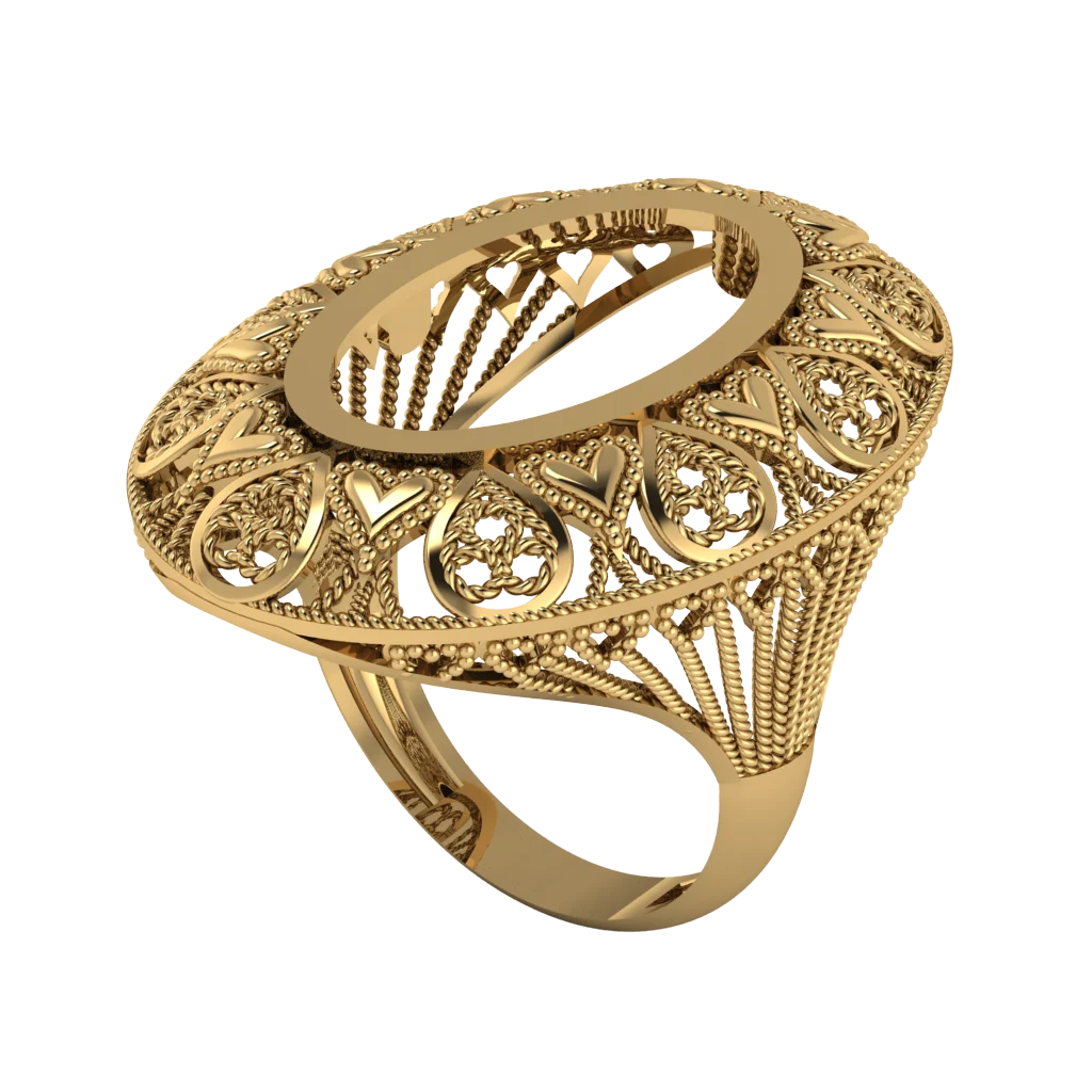 Кольцо с овальной площадкой, ажурным геометрическим узором и аккуратным декоративным акцентом в центре. В золоте модель выглядит утончённо и ярко.