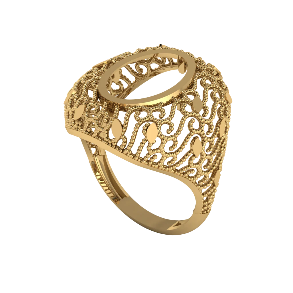 Женское кольцо с овальной площадкой и плавным кружевным орнаментом по боковой части. Золото подчёркивает мягкость линий и утончённость арабского узора.