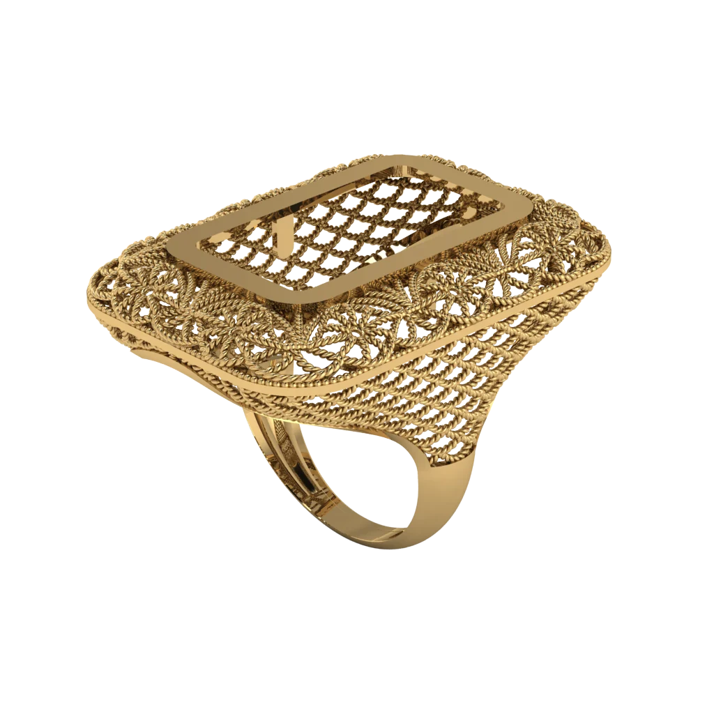 Крупное золотое кольцо с ромбовидной верхней частью и плотной решётчатой фактурой. Геометрия в арабском стиле делает модель необычной и заметной.