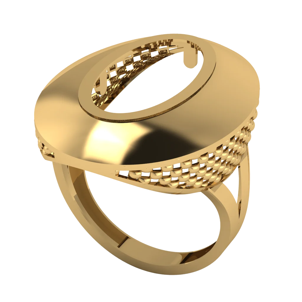 Женское кольцо из золота с овальной верхней частью и диагональной ажурной полосой по корпусу. Контраст гладкой и резной поверхности выглядит очень стильно.