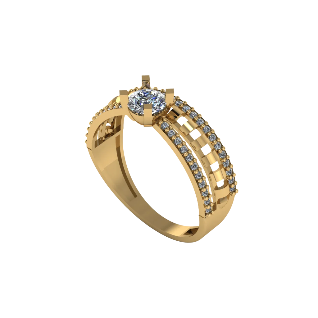 Дизайн с собранным блеском — по обеим сторонам идут дорожки камней, а сверху выделен один яркий элемент, создающий эффект «солитера»; золотая основа делает образ тёплым.