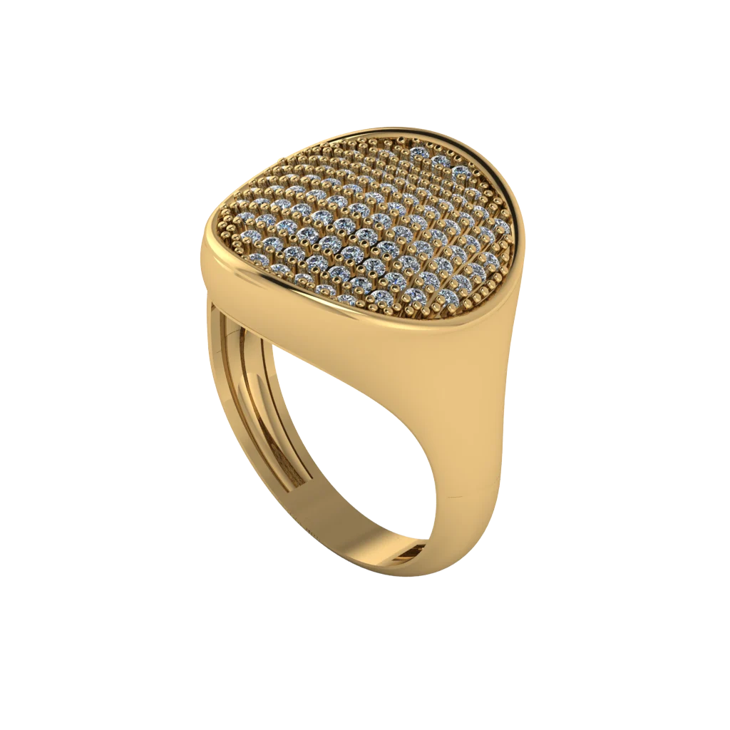 Модель-печатка с овальной площадкой — верх полностью покрыт мелкими камнями, создавая ровное «паве» сияние, а массивная золотая основа держит форму; эффектный вариант для тех, кто любит заметные акценты.