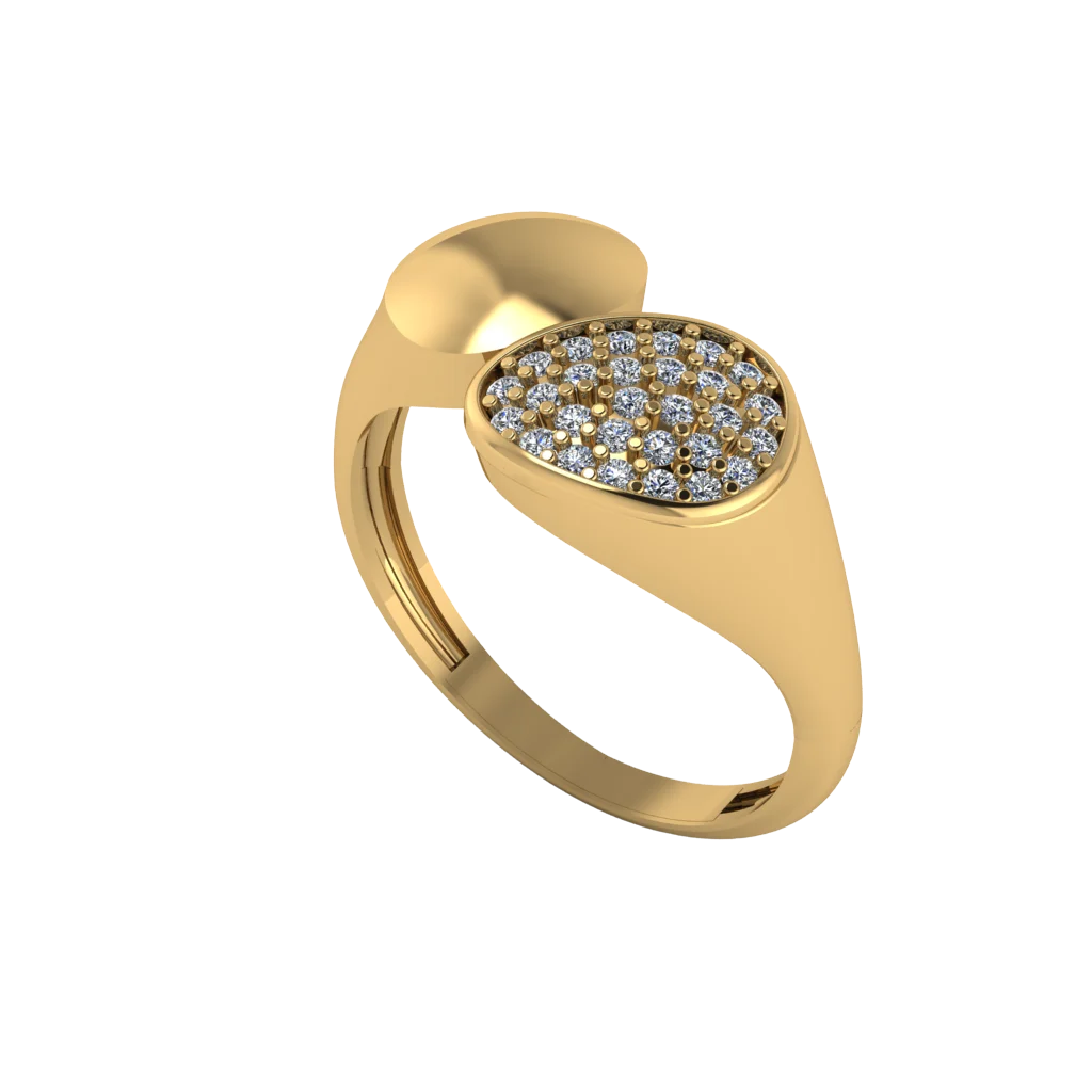 Современное разомкнутое кольцо из золота, верх образует мягкую букву V с небольшим камнем в центре и гладкими плоскостями по краям; минималистичная геометрия выглядит чисто и делает украшение заметным без лишнего декора.
