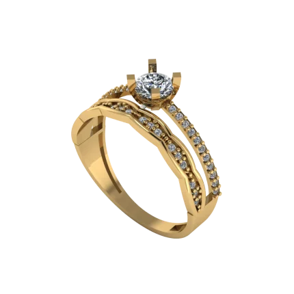 Широкий верх в золоте, полностью усыпанный мелкими камнями и собранный в мягкую асимметричную форму; плотная россыпь даёт яркое мерцание, а плавная шинка поддерживает аккуратный силуэт без резких деталей.