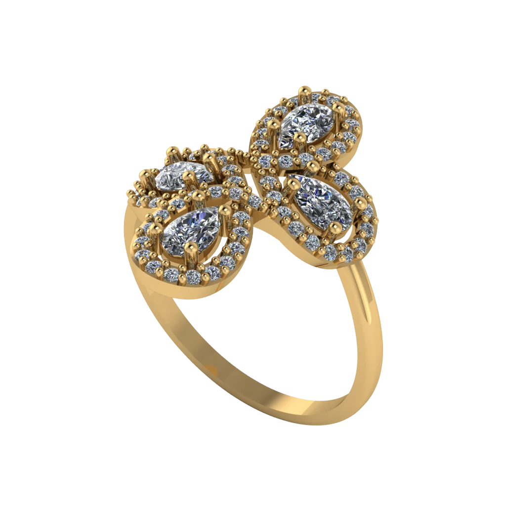 Кольцо из золота с тремя круглыми элементами, два боковых покрыты мелкими камнями, центральный украшен орнаментом и сиянием; асимметрия делает дизайн живым, а тонкая шинка сохраняет лёгкость посадки.