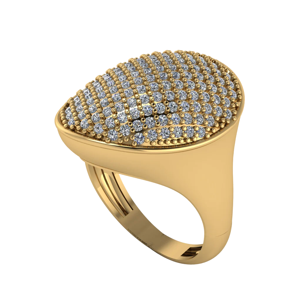 Выразительное украшение из золота с более широкой шинкой и заметным верхом, объем хорошо читается в профиле и смотрится уверенно; детали подчеркивают фактуру, а теплый оттенок металла делает кольцо нарядным и современным.