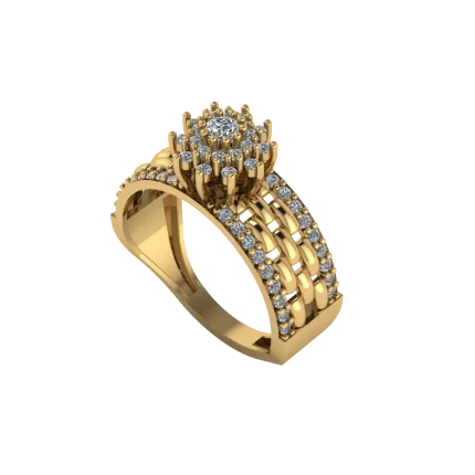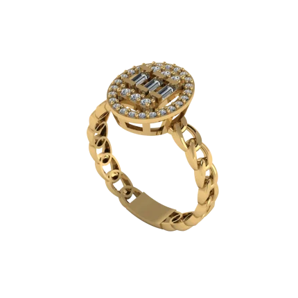Нарядная модель из желтого золота с подчеркнутым верхним элементом и аккуратным блеском камней, сочетание гладких плоскостей и блеска камней выглядит сбалансированно; форма удобна для носки и подходит под повседневный стиль.