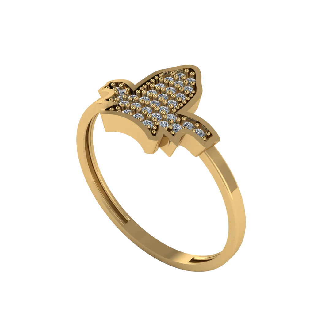Элегантное кольцо из желтого золота с выразительным верхом и небольшими камнями в отделке, сочетание гладких плоскостей и блеска камней выглядит сбалансированно; форма удобна для носки и подходит под повседневный стиль.