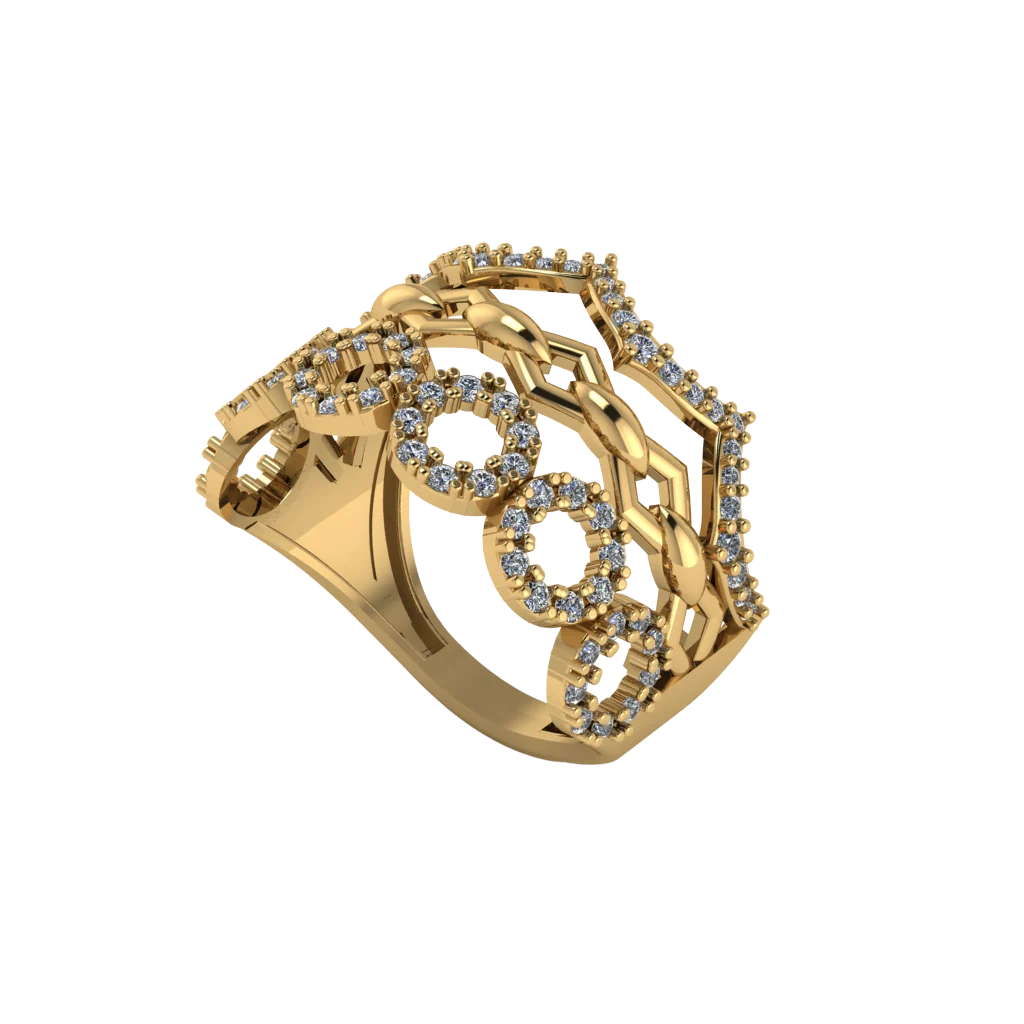 Изящная форма из желтого золота с заметным верхним оформлением и аккуратными камнями, сочетание гладких плоскостей и блеска камней выглядит сбалансированно; форма удобна для носки и подходит под повседневный стиль.