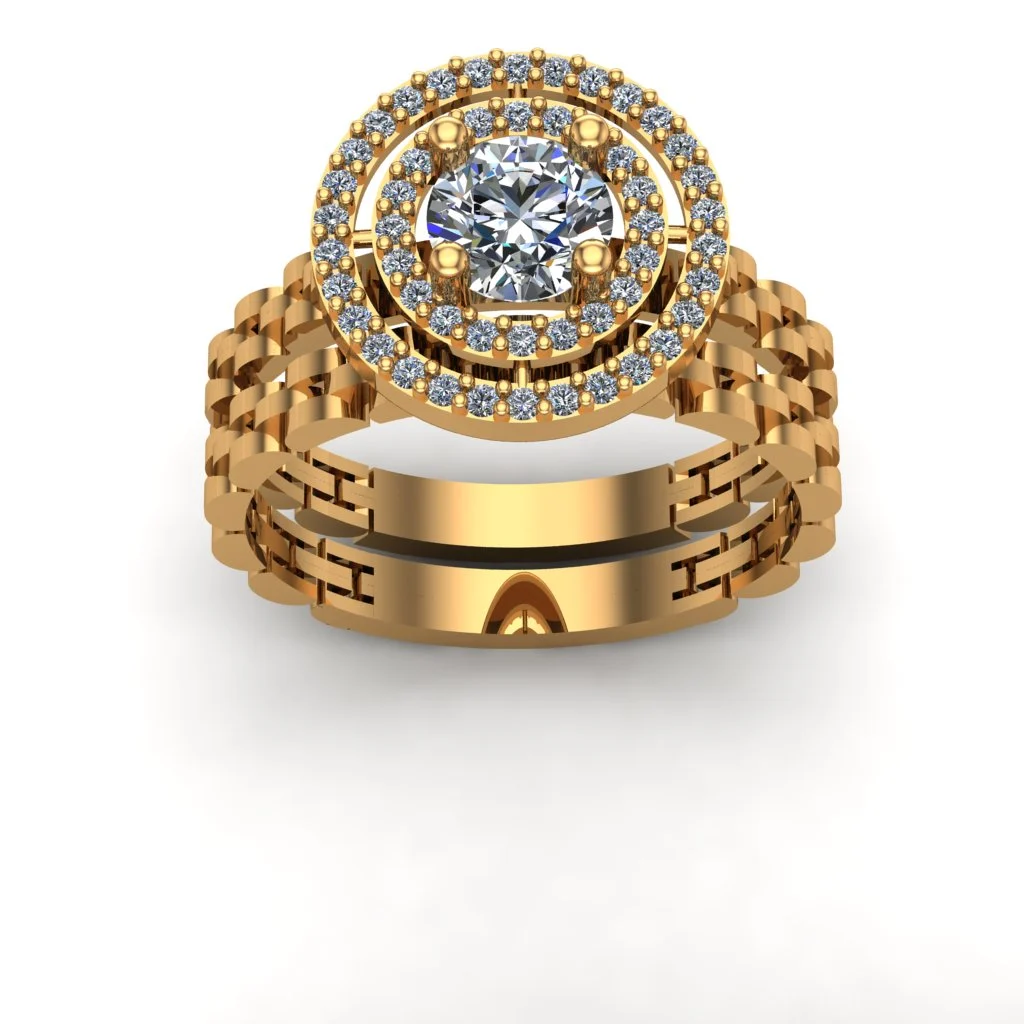 Круглый центральный камень и двойной ореол создают эффект «сияющего диска»: широкая шинка многоярусная, с рельефными звеньями, а тёплое золото подчёркивает объём и плотное мерцание вставок.