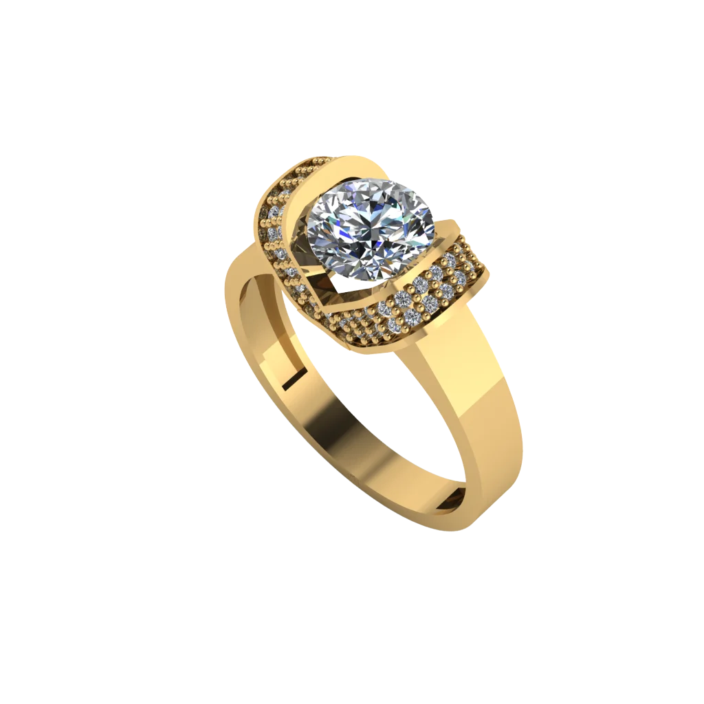 Чёткая геометрия верха выделяет квадратную площадку с центральным камнем и рамкой мелких вставок; тёплое золото шинки отполировано, поэтому строгие грани и отражения выглядят особенно чисто.
