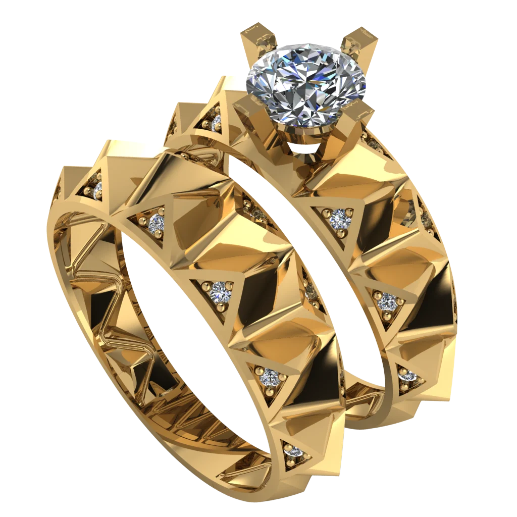 Кольцо с центральным камнем и широкими диагональными перемычками на шине: прорези создают динамичный рисунок, а полировка в золоте усиливает контраст между объёмом верха и строгой геометрией панелей.
